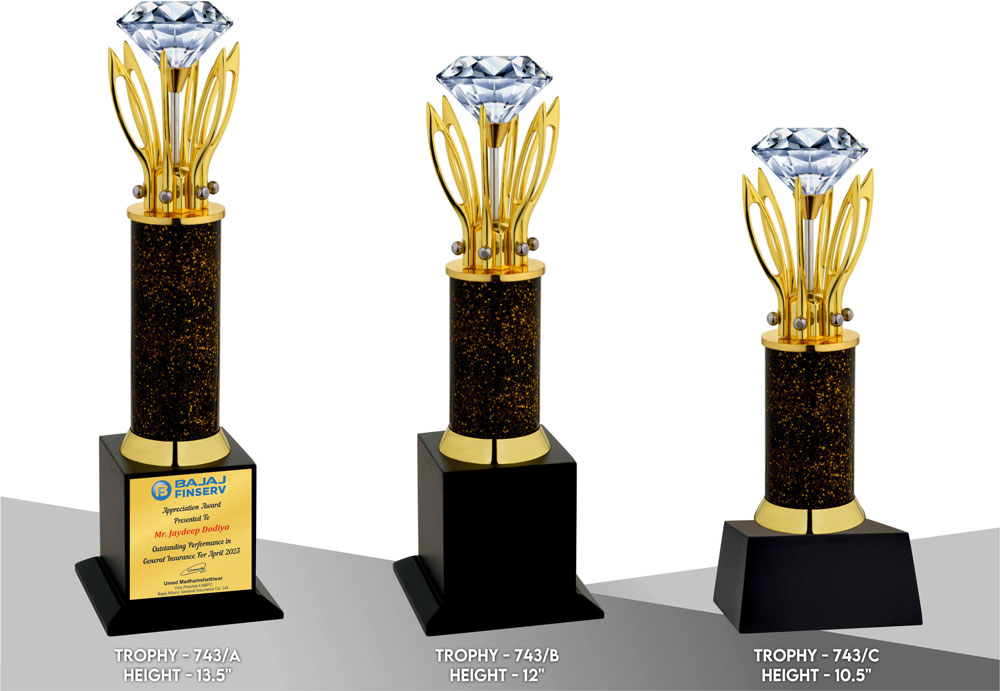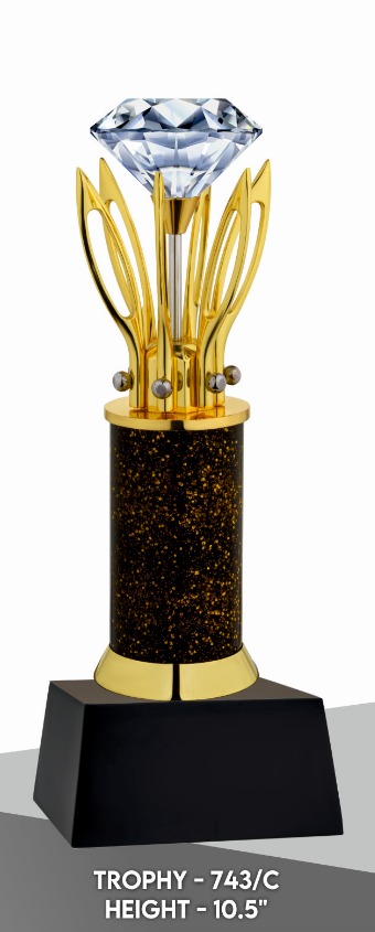 A metal trophy is a durable, often customizable, award presented to recognize achievements, typically crafted from metal and designed for a sleek, modern appearance, available in Gold finish with Diamond fitted on top gives awesome look.